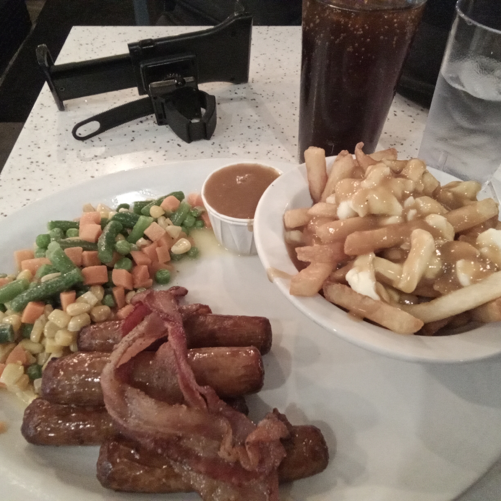 Pork Sausage, Bacon BBQ Sauce, Mixed Vegetables, Poutine And A Pepsi Mix With Orange Crush. 😀😂🙂😇🥰😍🤩😈🙏🤟🦸♂️🦹♂️🥩🌭🥒🍆🥕🥔🍅🌽🍟🍖🐖🐷🐽🐗